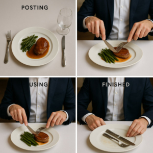 - Finished eating: place knife and fork parallel on the plate, handles at 4 o’clock, tips pointing to 10 o’clock. This discreetly signals the waiter you are done.
